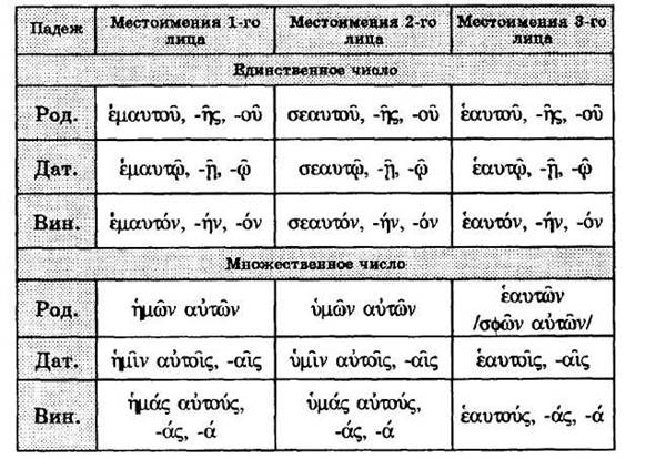 Сочетания основы личного местоимения и местоимения αυτός суть возвратные местоимения, которые, не имея именительного падежа единственного и множественного числа, склоняются как прилагательные трех окончаний II и I склонения.